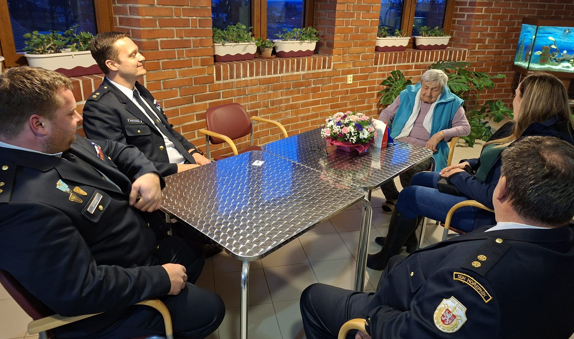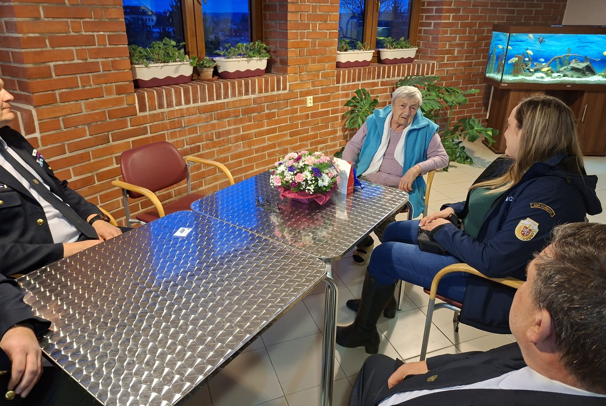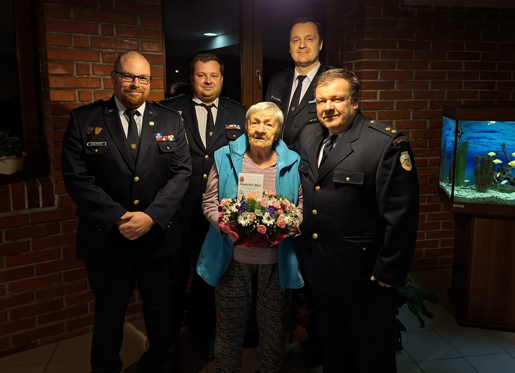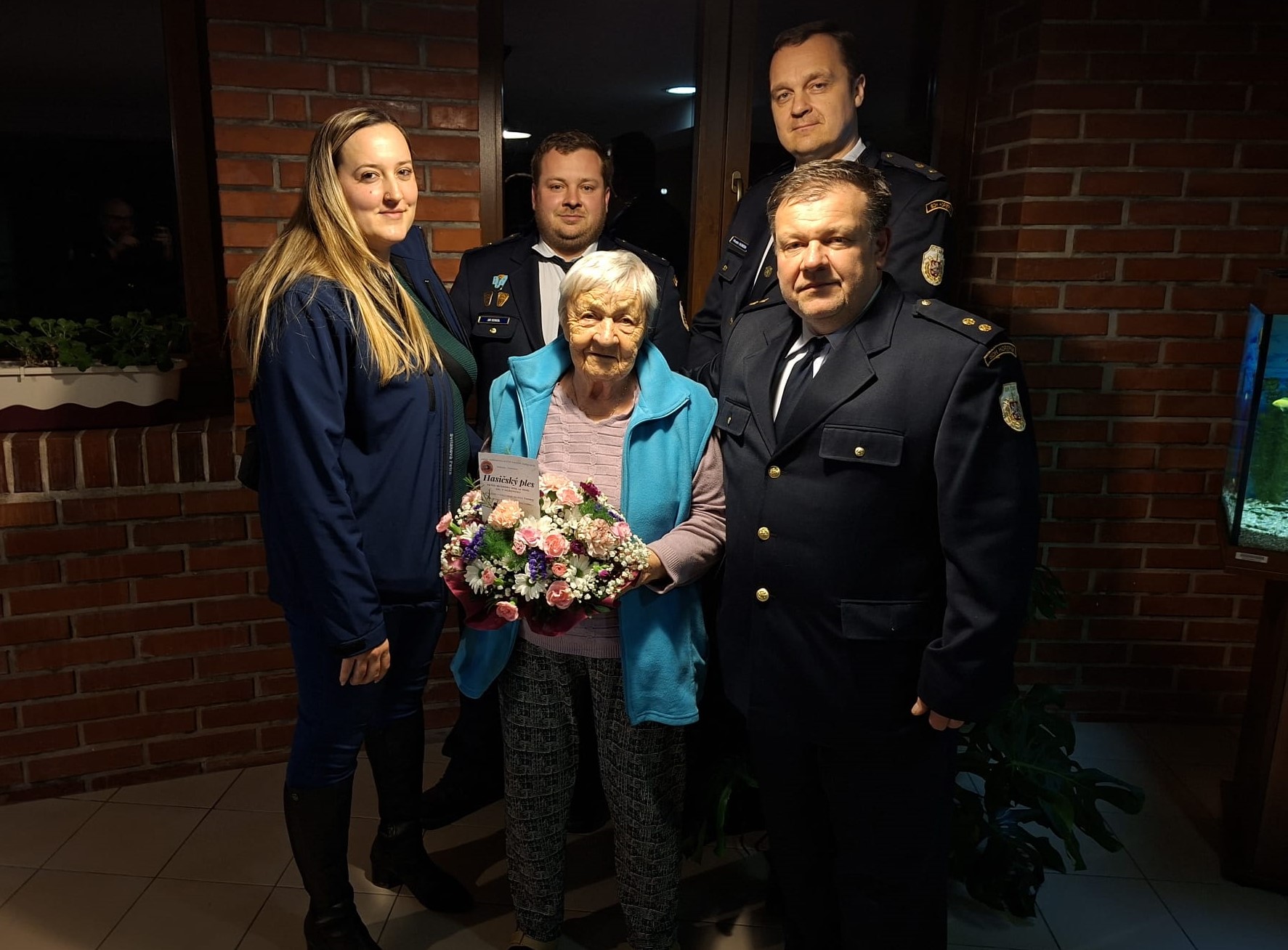 Letošní rok jsme se však na naši milou členku nedozvonili, jelikož v současné době tráví čas v Domě sociálních služeb v Pacově. Ale tradice je tradice, a tak jsme vyrazili ve složení: Ondřej Přástka, Miroslav Svoboda, Jiří Sokol st., Jiří Sokol ml. a Petra Svitáková za Marií do Pacova. A setkání to bylo úžasné. Předali jsme květinu a drobné dary, ale hlavně tradiční pozvánku na ples. Sice víme, že se nedostaví, ale radost jí to udělalo velikou. Tím druhým důvodem návštěvy, byla nepřítomnost paní Bezděkové na VVH sboru, která se konala před měsícem a kde byla Marie oceněna stužkou za 40 let členství a obětavé práce u SDH Hořepník.